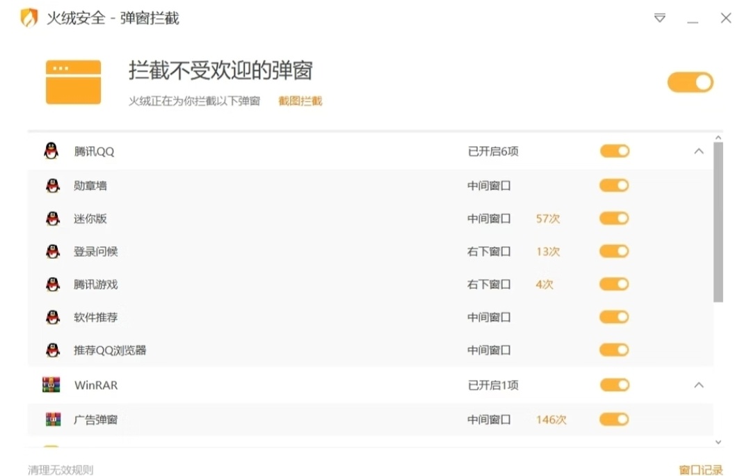 火绒弹窗拦截(独立版)无需安装完整火绒软件,独立版一键开启,个人感觉比某60的好用。