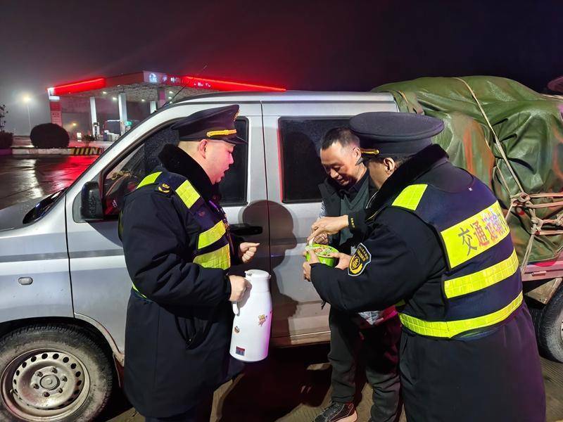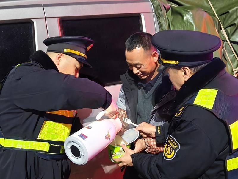 考虑到夜间气温持续走低,执法人员主动上前询问司机需求,细心叮嘱其做好防寒保暖和安全防范工作,并为其送上方便面、冲泡热水。一碗热气腾腾的泡面,一句贴心的叮嘱,不仅驱散了冬日的严寒,更让司乘人员感受到了交通执法的温度。