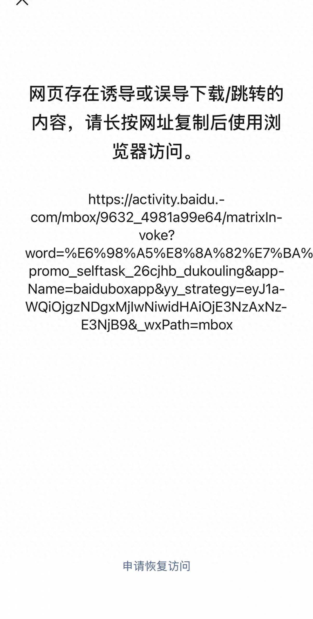 DoNews2月4日消息,今日晚些时候,继元宝红包分享链接之后,百度文心助手红包分享链接也被微信屏蔽,页面显示网页存在诱导或误导下载/跳转的内容,需要跳转第三方浏览器访问。