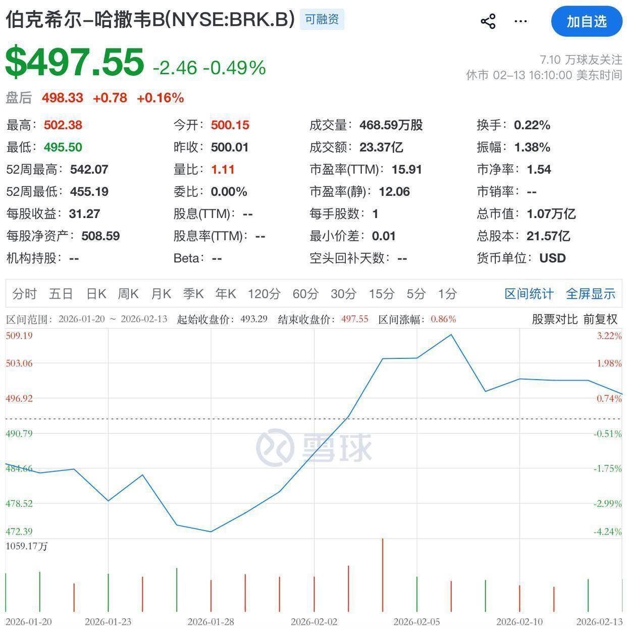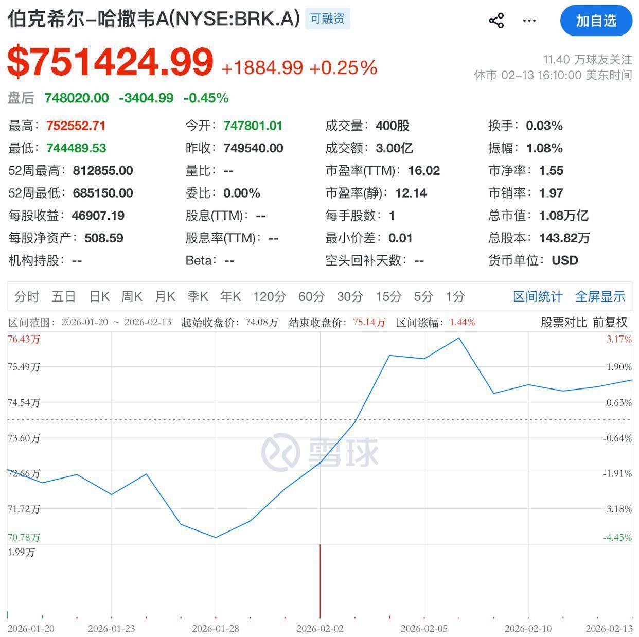 伯克希尔A类股(BRK.A)近期交易活跃度波动,2月13日收盘价为751,424.99美元,单日涨幅0.25%,B类股(BRK.B)2月13日收盘价为497.55美元,单日跌幅0.49%。